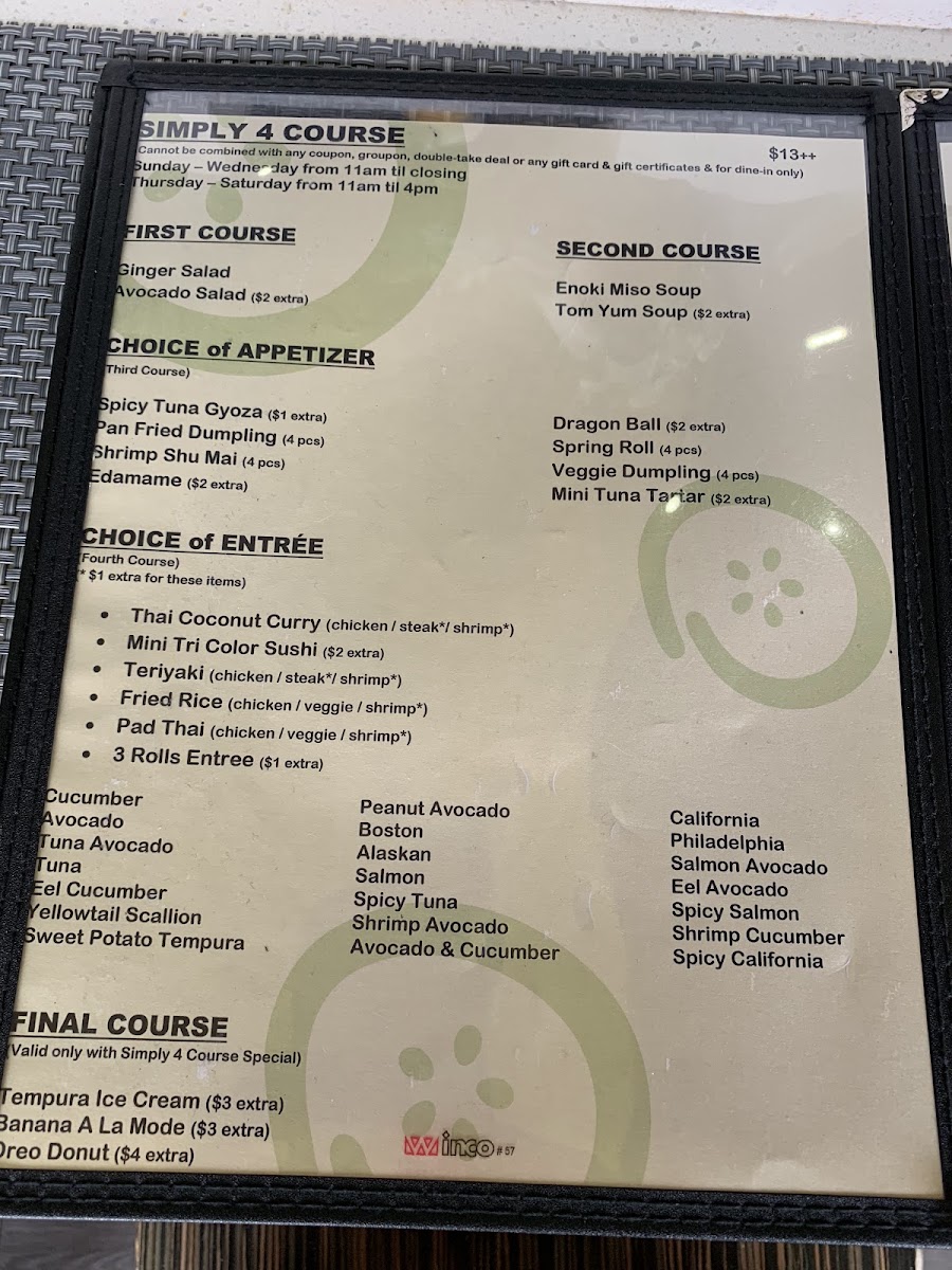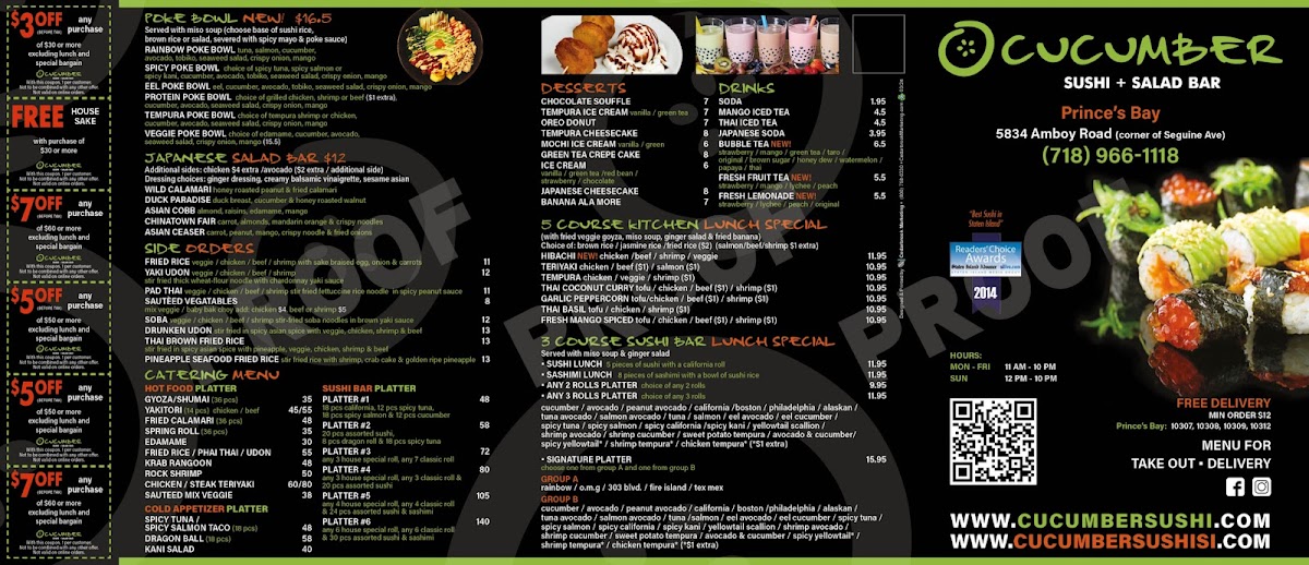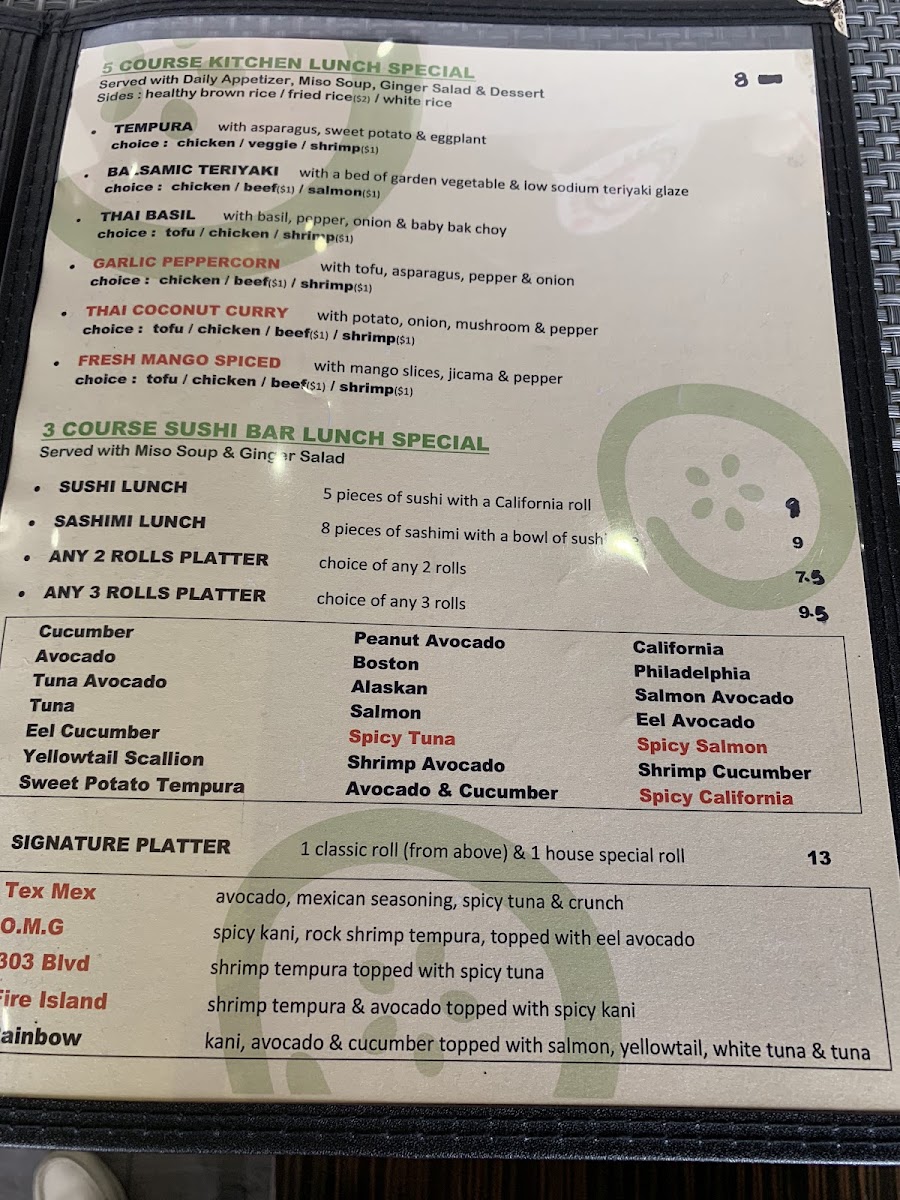 Cucumber Sushi & Salad Bar offers a menu that balances fresh, vibrant flavors with approachable options for both sushi enthusiasts and casual diners. Highlights include the Salmon Teriyaki Lunch Special, a perfectly glazed fillet served over rice that exemplifies the kitchen’s skill in blending sweetness and savory depth. The Tuna Tartare impresses with its clean, delicate texture and nuanced seasoning, making it a standout starter. For those seeking a bit of heat, the Spicy Tuna Gyoza delivers a satisfying kick wrapped in a crisp, golden exterior. The classic Spring Roll is light, crisp, and filled with fresh vegetables, providing a refreshing contrast to richer offerings. Overall, the menu demonstrates a thoughtful selection of dishes that emphasize freshness, balanced flavors, and a careful attention to presentation, making it a reliable choice for a flavorful, well-rounded meal.